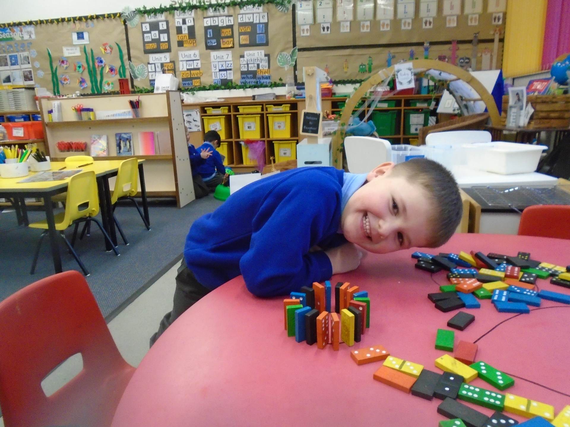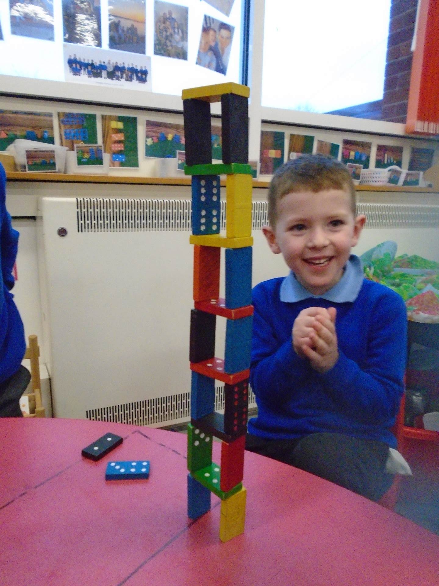 They have built number stacks with multilink cubes, carefully clicking the cubes together and pulling them apart to build finger strength, then matching each stack to the correct numeral. The children have also enjoyed stacking and balancing dominoes to create tall towers and domino structures, which has supported their hand–eye coordination and careful control. Some have even begun learning how to play dominoes, practising precise placement and turn-taking.