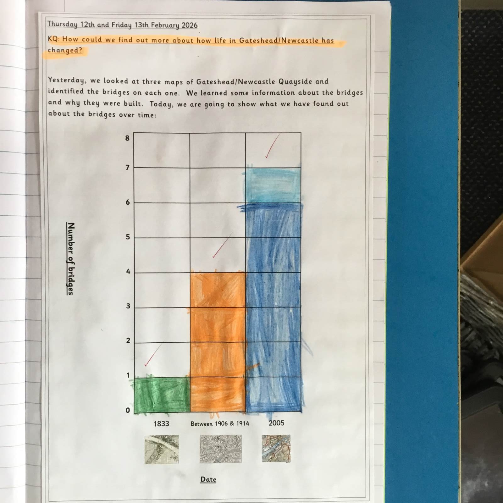 We also examined maps of the Quayside from different periods. The children noticed that, over time, the number of bridges increased. This led to great discussions about why more bridges were needed and how they help people travel across the river.