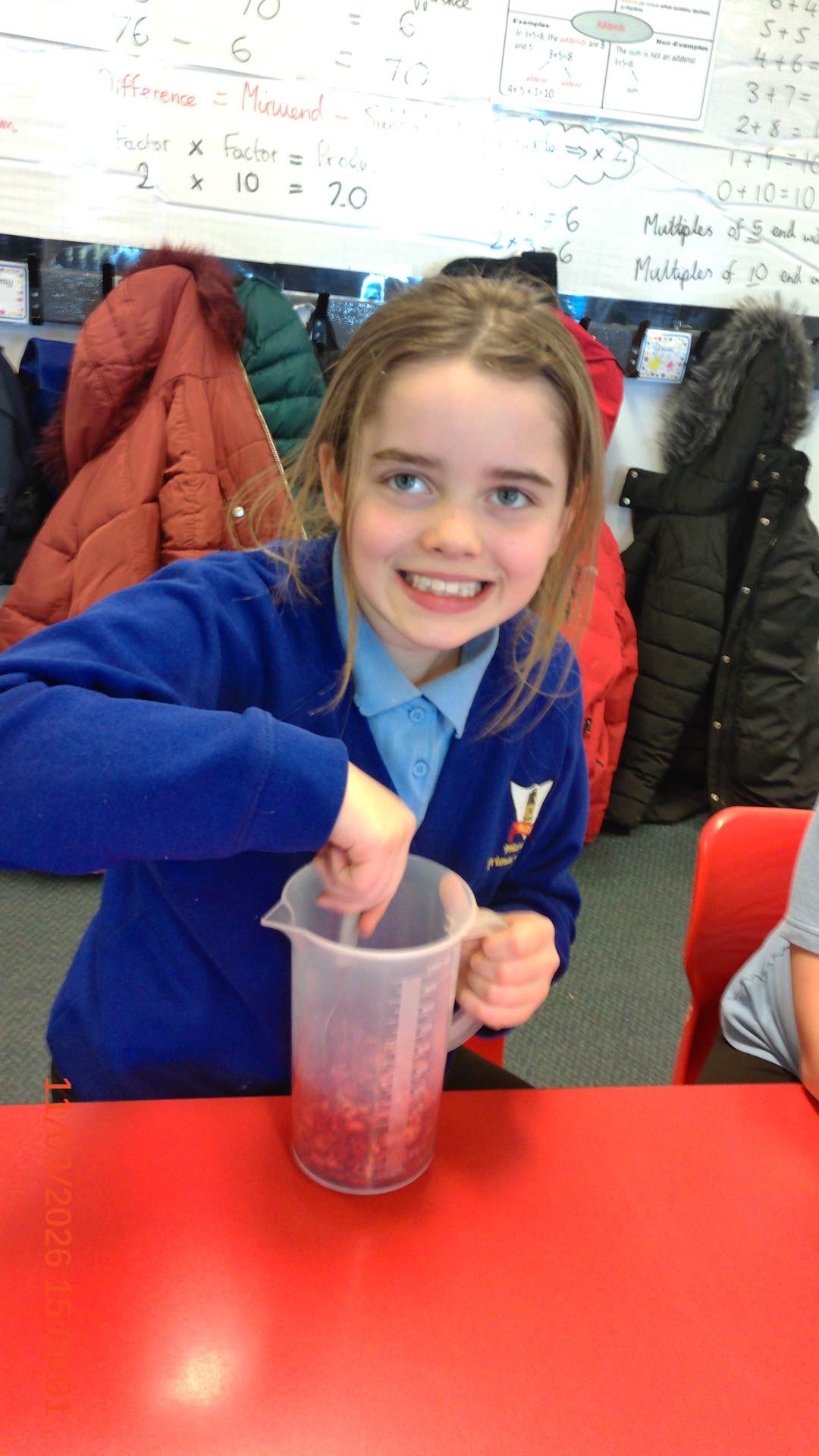 The children used yellow food dye and water to represent the plasma in the blood. They used a mixture of red food dye and cereal to represent the red blood cells and white marshmallows to represent the white blood cells.